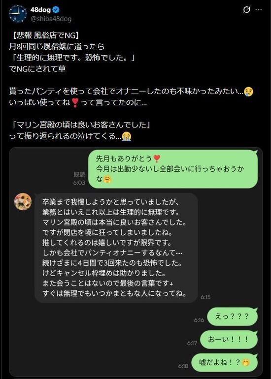 【悲報】男さん月8回同じ風俗嬢に通ってNGされる「生理的に無理です。恐怖でした」